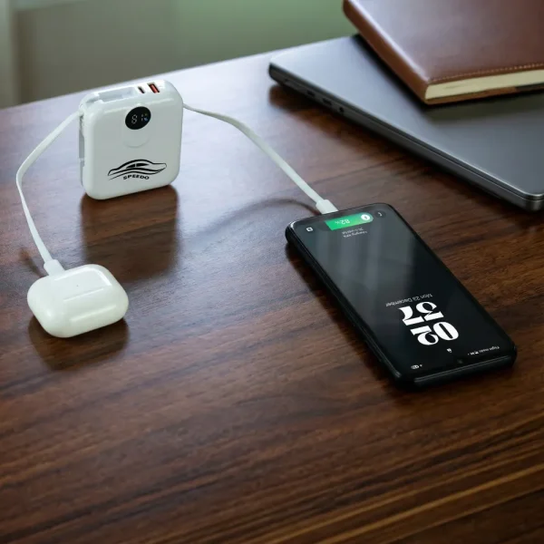 This compact 10,000 mAh powerbank offers fast charging performance with a rated energy of 38.5Wh and built-in Type-C and Lightning cables for maximum convenience. Designed with an ABS plastic body, it features a digital display screen for real-time battery status and supports multiple fast-charging output modes. Its sleek and portable design makes it ideal for corporate gifting, travel, everyday use, and branded promotional giveaways. Packaged in a premium black hardboard magnetic closure box, this powerbank ensures both function and presentation at a top-quality level.